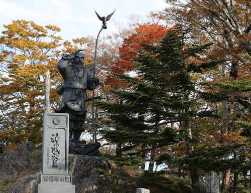 大蛇嵓の前に見た神武天皇の像。多分杖の上は八咫烏。