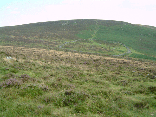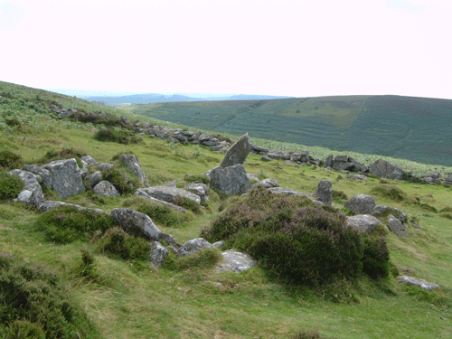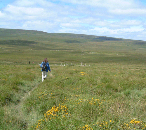 ヒース咲く荒れ地を歩く、彼女の前にストーンサークルが見えています。