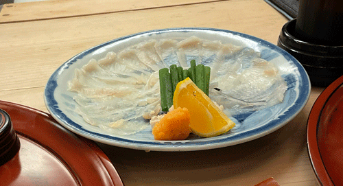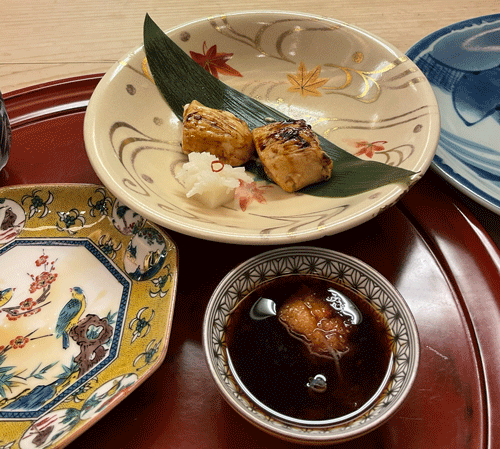 右からタラの白子の焼き物、中央はトラフグのから揚げ、右は伊勢海老とアスパラガスの焼き物