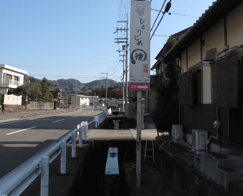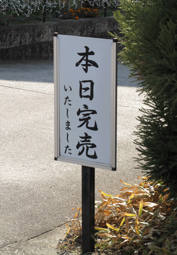 左側の写真から、見えている道は県道179号線(県道吉備湯浅線)、そして道沿いに立つ看板、しかし朝8時開店の9時半の時点で『本日完売』の立て看板。