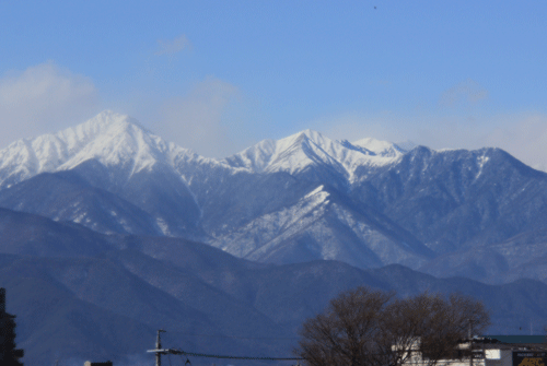 松本駅頭から見えた景色でした。到着時非常に快晴で雪を抱いた山がきれいに見えました。