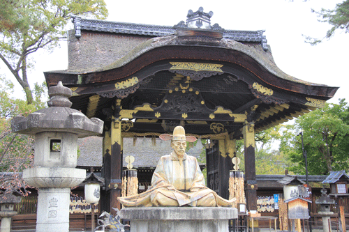 左は豊国神社前の秀吉の像、右は国宝の唐門。