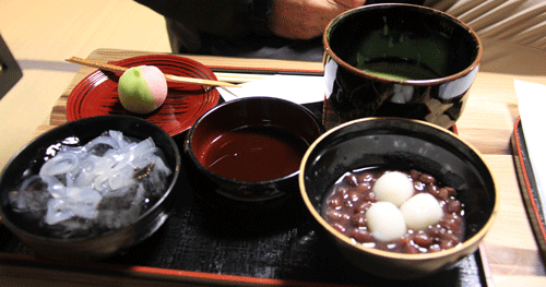 お盆中央は葛切りのための黒蜜、向こう側の左は和菓子、そしてお抹茶という取り合わせ。
