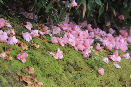 落花した椿の花が美しい緑の苔の上に飾られています。